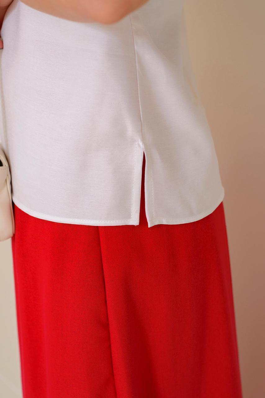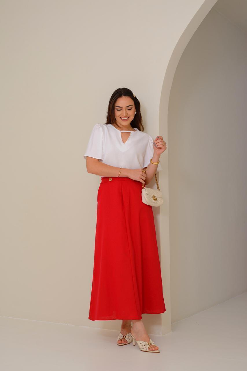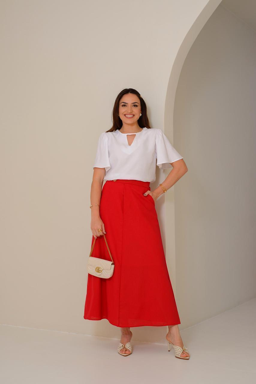 O destaque fica por conta do decote com recorte em gota, um detalhe delicado que valoriza o colo sem perder a essência modesta da peça. As mangas curtas amplas, com leve volume, adicionam movimento e feminilidade ao look, criando uma silhueta leve e refinada.