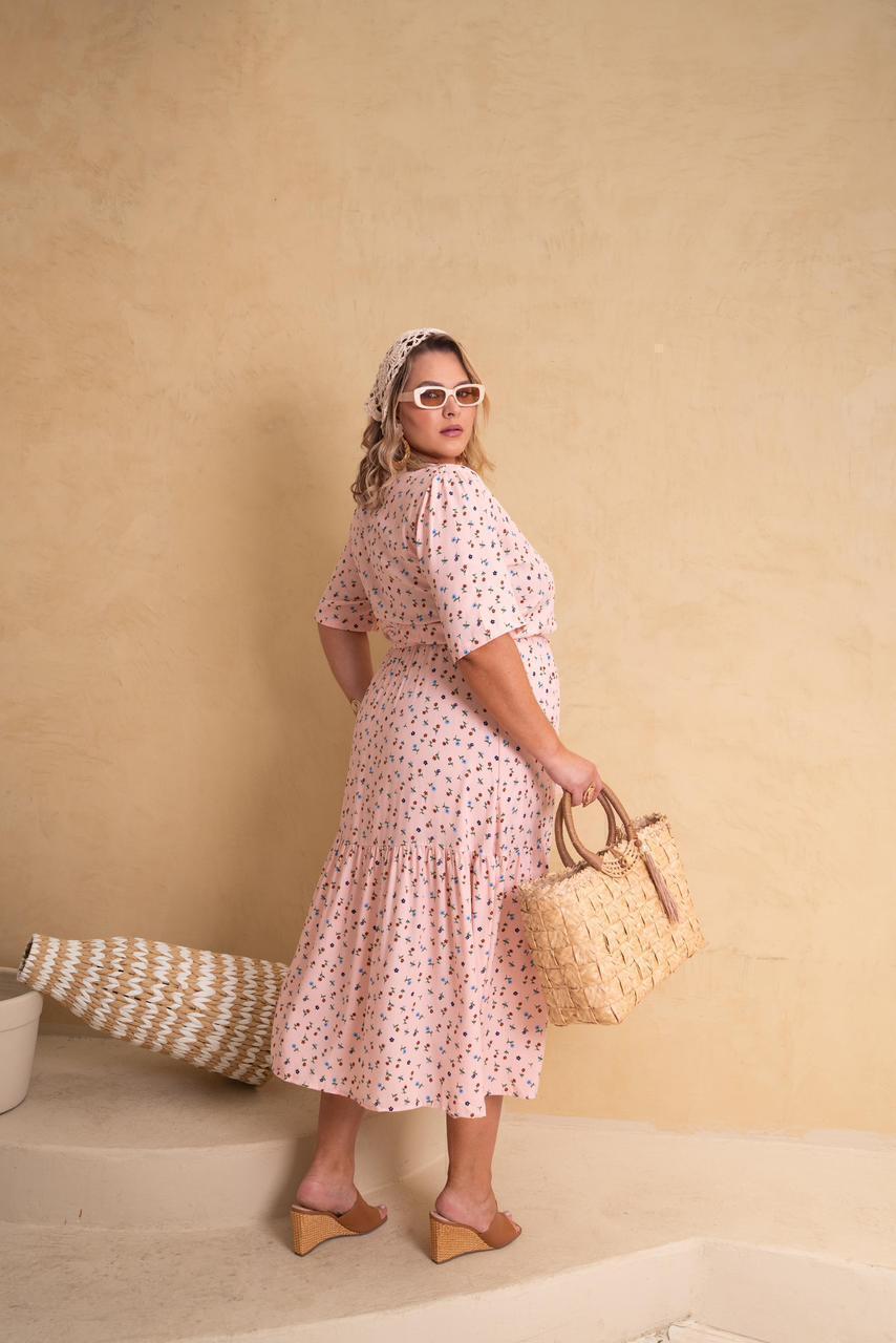 Vestido composto em viscolinho forrado, possui babado na barra, elástico na cintura e acompanha o cinto no mesmo tecido (uso opcional).