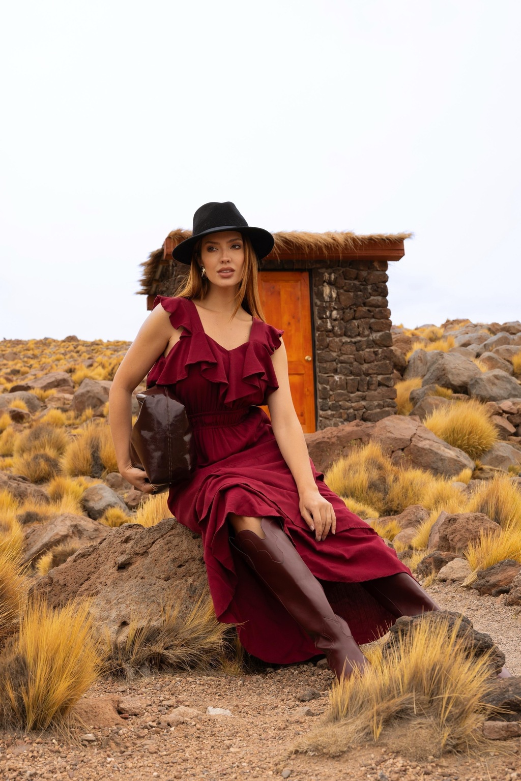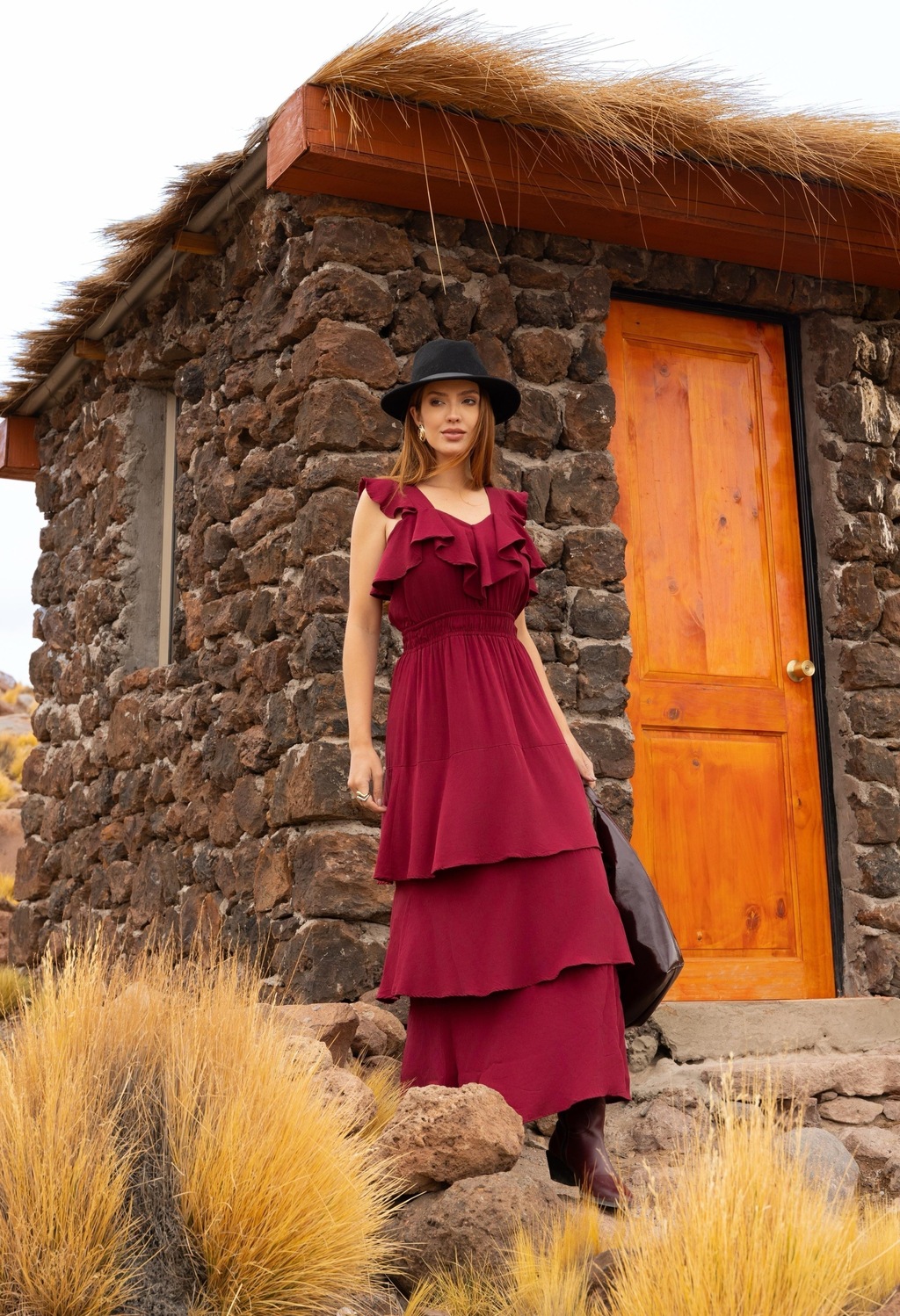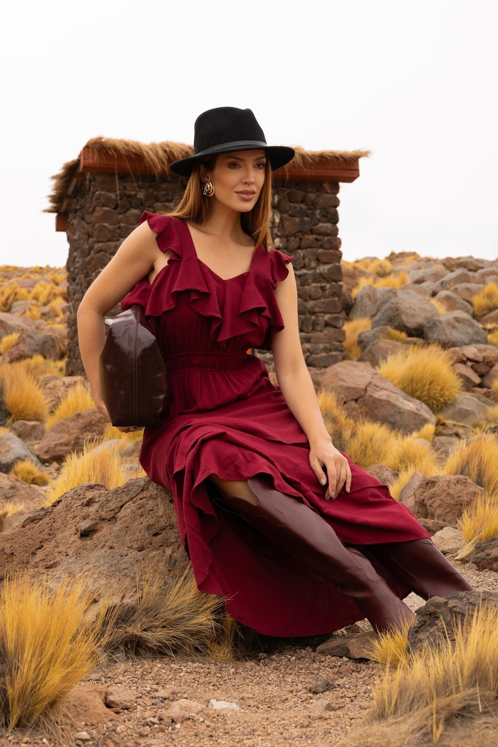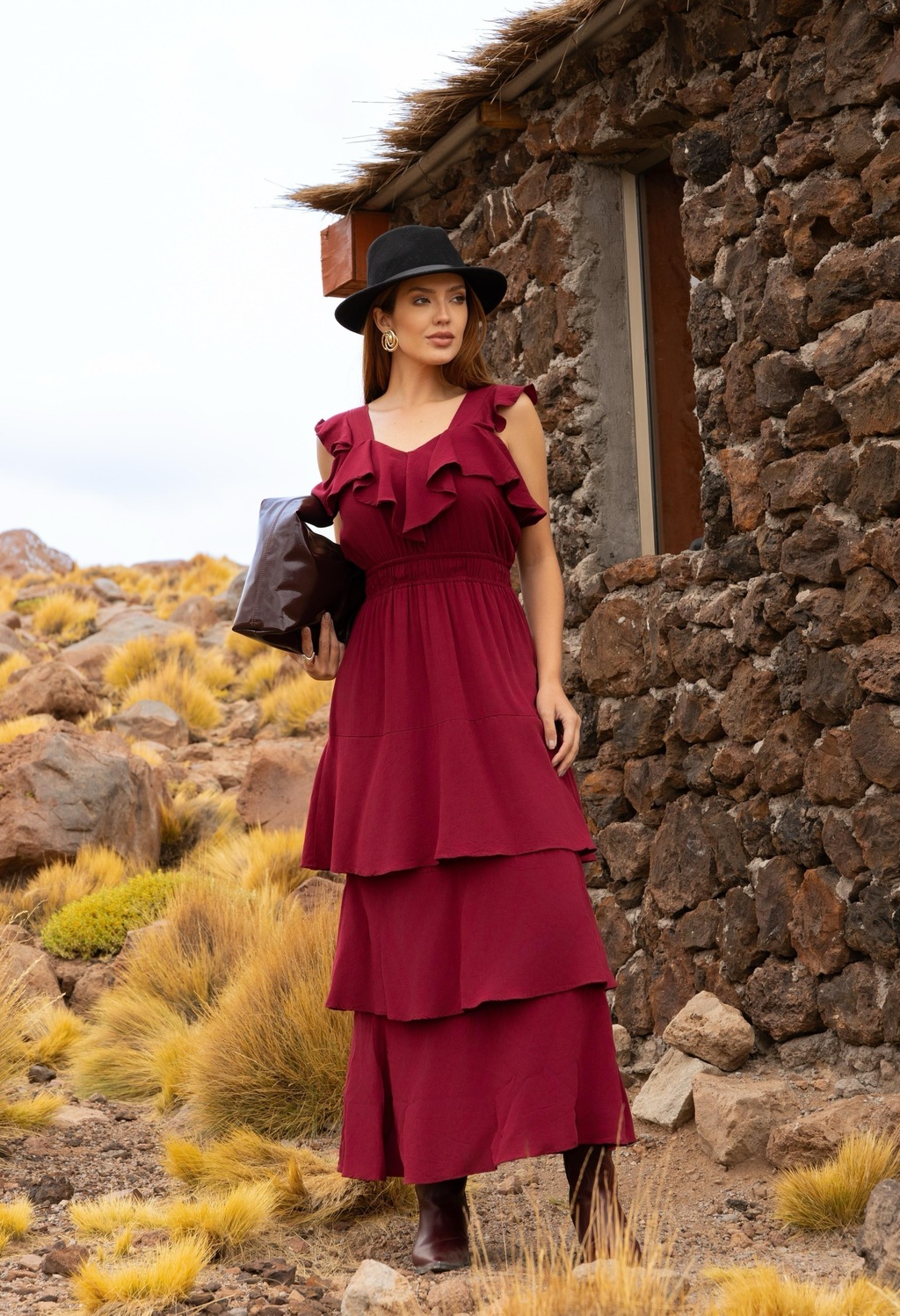 Confeccionado em tecido vicolinho, é um modelo longo com decote em V e acabamento em babados volumosos que valorizam o colo e trazem romantismo ao visual. As alças largas também são adornadas com babado, que além de charmosas, proporcionam conforto e sustentação. A cintura possui elástico e a saia com suas camadas de babados confere movimento e um toque boho sofisticado.