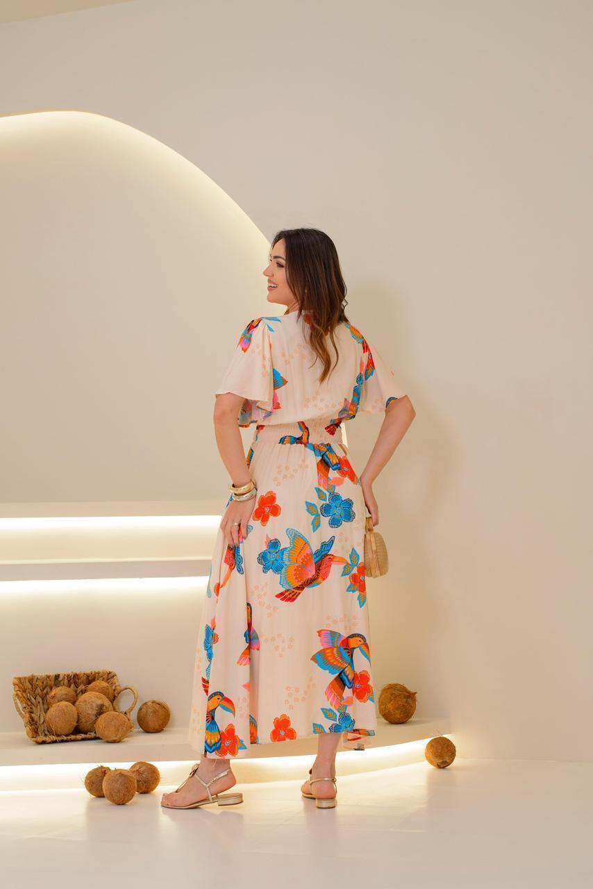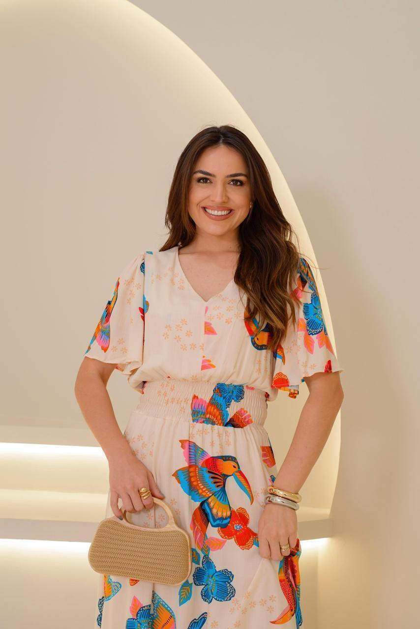 ° Mangas curtas com modelagem godê e babado sutil, garantindo movimento e feminilidade.
