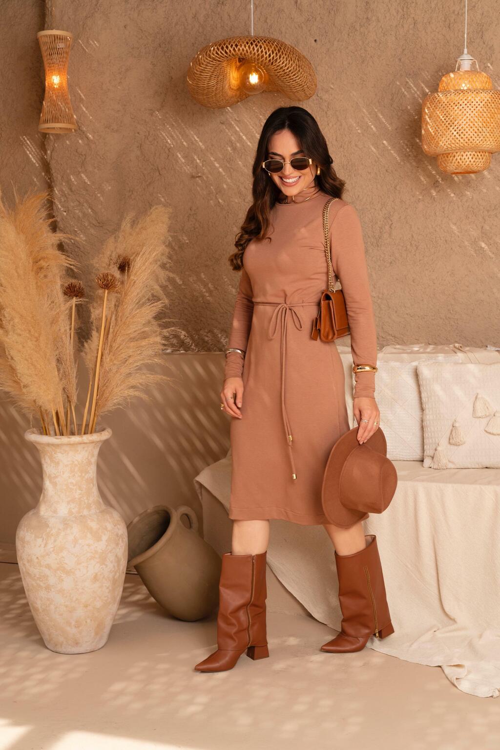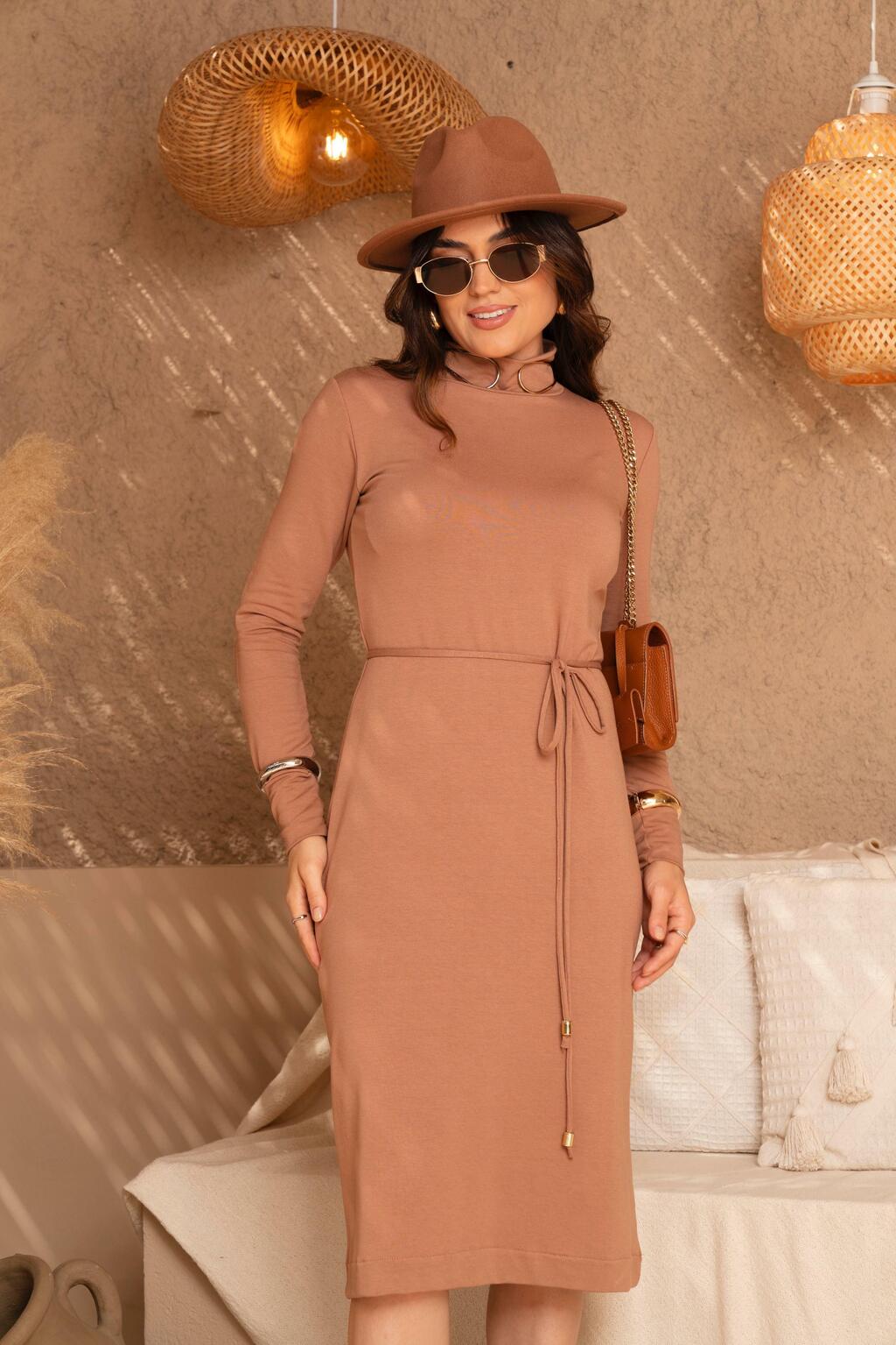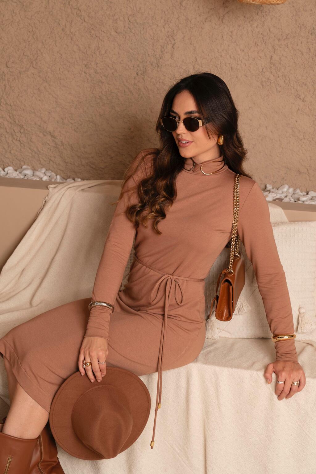 Possui gola alta discreta e mangas longas com acabamento nos punhos, trazendo elegância e proteção extra para dias mais frescos. O caimento impecável valoriza todos os tipos de corpo, enquanto o comprimento midi garante estilo e modéstia na medida certa.